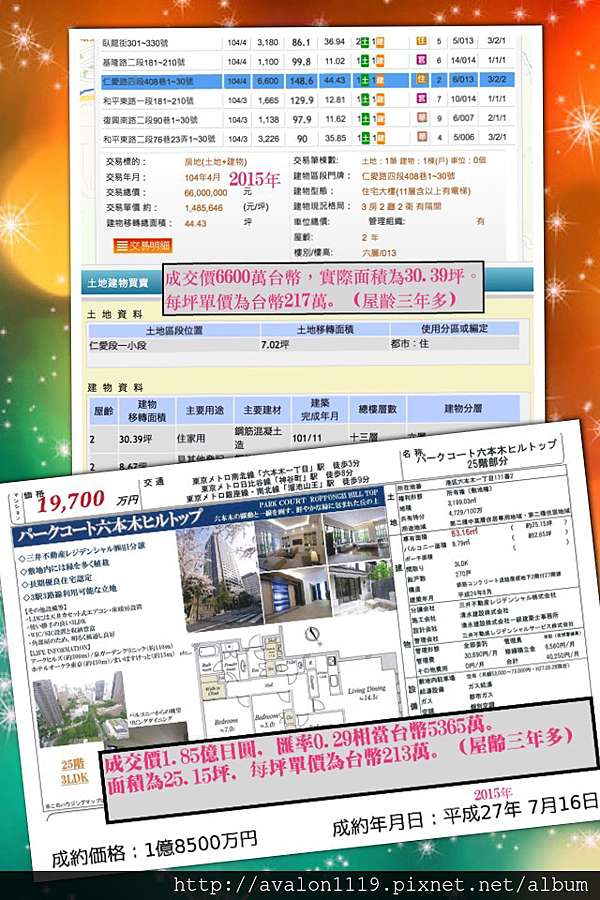 兩個地點都是蛋黃中的蛋黃。台北的是2015年4月成交,東京的是2015年7月成交,成交離得沒很遠,且兩者屋齡接近。實際室內面積坪數也相當,台北的為30坪左右,東京的為25坪左右。仁愛路的台幣6600萬,六本木的台幣5365萬。