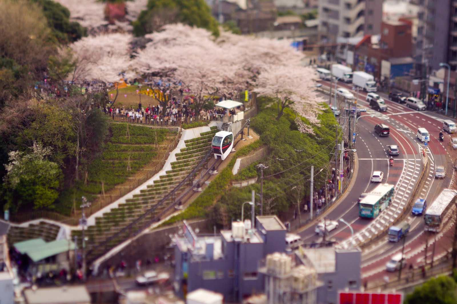 飛鳥山最有名的就是從入口可以坐單軌纜車到山頂,不管是老年或者行動不方便的人也可以輕鬆的享受櫻花的美景。