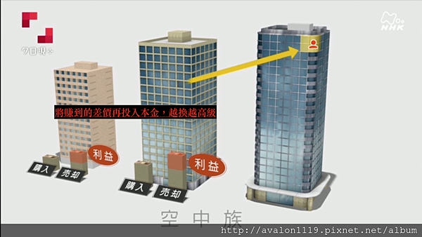 例如:如果你有300萬,現在日本正常的上班族,可以九成貸款,這樣你是不是就可以買3000萬的物件呢?然後過一年後,轉賣4000萬,這時你還了房貸後,你的現金就會有1300萬了不是嗎?同理,1300萬能玩多少錢的物件?當然就是1.3億囉!當然第二次換屋,一次爬這麼多也是風險高,但是至少現在1300萬的本金,要買個7000萬的物件不成問題。接下來再轉賣個9000萬,你的本金就又膨脹到3300萬了。這時可以玩多大的槓桿,可想而知。節目中就還採訪了一個空中族,他就說,「他的朋友」就是這樣,越換愈大,短短幾年換了五次房。