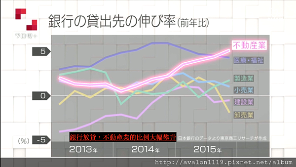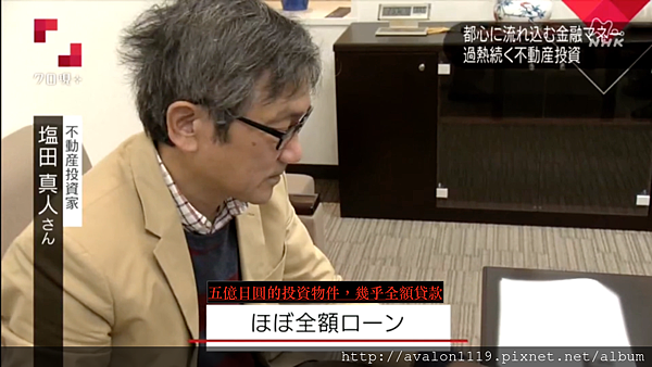除了超高層塔式住宅的炒房一族以外,現在的個人投資家也越來越多。因為量化寬鬆導致的游資過多,再加上負利率,使得銀行積極尋找資金的出口,因此根據節目的採訪,現在許多個人投資家,幾乎都可以全額貸款買到一整棟的投資物件。因為對銀行而言,其實不動產相對安全。根據調查,近年來銀行放貸給不動產業的比例,逐年增加。