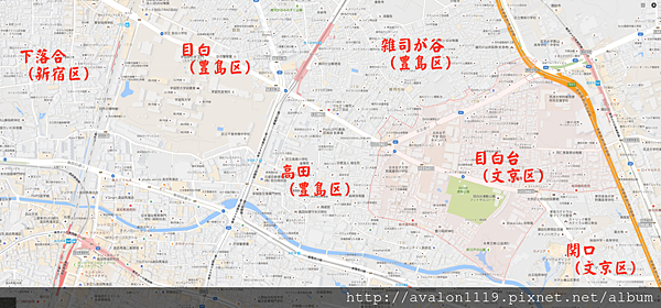 記得第一篇,是講高級住宅區「目白」的左半邊,「下落合」。但不動產業者口中的「目白」高級住宅區,其實指的範圍還蠻廣的,總共橫跨了三個區。從左邊的新宿區的「中落合、下落合」,一直到學習院大學這裡的豐島區「目白、高田、雑司が谷」…甚至延伸到左邊的文京區「目白台、関口、音羽」這裡,都是屬於高級住宅區「目白」的範圍。不知道是不是像這樣把範圍擴張很大,可以讓不動產業者比較好賣房子,所以才把一些根本也不是很高級的地方也畫進高級住宅區。