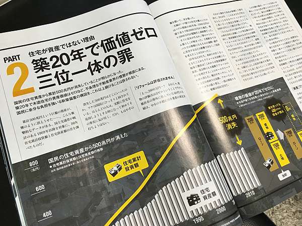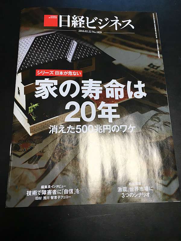 2016.02.22出刊的「日経ビジネス」就做了這樣的不動產的專題。觀察細微,有些點,也跟我的想法有媒合之處。例如日本人的「全新潔癖」,以及仲介業者的「黑箱坑殺買賣雙」行為等。都是導致日本不動產到了中古時,價格跌跌不休的主因之一(當然通縮環境也有影響,但報導中沒有提及這一點)。報導一開始就提及,全世界很多國家的房屋都是「資產」,唯有日本的房屋是「消費財」(負債),因此從1969年之後,高達500兆日圓的全民住宅資產就這樣靜悄悄的消失了,連寫特輯的記者也認為這樣的現象其實不合理,期待有朝一日會逆轉。